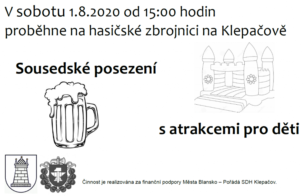Přijměte pozvání na letní sousedské posezení za hasičskou zbrojnicí. Koná se v sobotu 27.7.2019 od 16:00 hodin za hasičskou zbrojnicí. Těšit se můžete na dobře vychlazené pivo, nealko a dobroty z grilu a udírny. Dá-li bůh, tak také přijde i umělec s kytarou. Srdečně zvou členové SDH Klepačov.