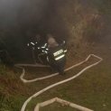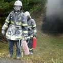 Fotografie: Příprava. Plnění klíštěte vodou. Nějak se nám to nepovedlo uhasit. To nejsou mlynáři, to jsou hasiči po použití práškových přístrojů. Instrukce před akcí. Pokus Lovčišských o průnik bez dýchacích přístrojů - nepodařilo se.