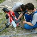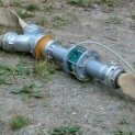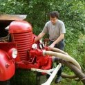 Fotografie: příprava proudnice a ovládání ke zkouškám, průtokoměr k měření okamžitého průtoku proudnicí, muzejní stroj Praga RN dodává vodu, proudnice v akci.
