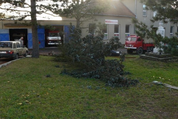 Kácení stromu před hasičkou.