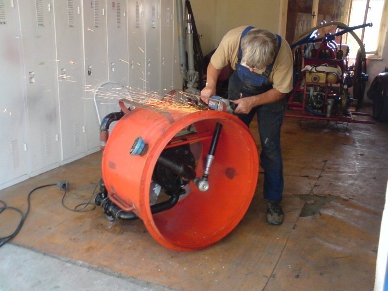 Stručný popis zařízení:Tělo stroje - roura použita z důlního větráku, stejně jako vrtule průměru 800 mm. Je možno použít z čehokoliv podobného, nebo nechat vyrobit na zakázku, použit materiál tloušťky min. 3 mm, z důvodu nosnosti hydromotoru a celého stroje. Počítat s dostatečnou rezervou pro uchycení hydromotoru. Na bocích opatřeno madly pro snadný transport, vespod lyžiny shodné s roztečí PS 12. Opatřit ochranným pletivem proti vniknutí cizích částí do roztočené vrtule.