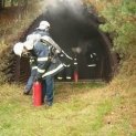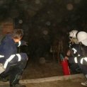 Fotografie: Příprava. Plnění klíštěte vodou. Nějak se nám to nepovedlo uhasit. To nejsou mlynáři, to jsou hasiči po použití práškových přístrojů. Instrukce před akcí. Pokus Lovčišských o průnik bez dýchacích přístrojů - nepodařilo se.
