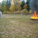 Fotografie: Příjezd cirkusu na hřiště. Navlékání hasiče do alobalu. Bubák i minimax připraveni k akci. Zakládání požáru. A už nám to hoří. Oheň je neúměrný použitým hasicím prostředkům, ale nemůžeme to přehánět. Zásah práškem. A je uhašeno. V praxi by se to muselo hned pokrýt pěnou kvůli opětovnému vzplanutí. Po vypálení zbytku hořlaviny se nádrž ochladila vodou, příprava k odjezdu.