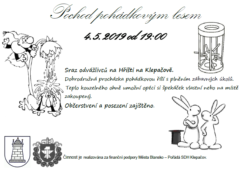 Sraz odvážlivců od 19:00 hodin na hřišti na Klepačově. Krátká dobrodružná procházka pohádkovou říší v okolí Klepačova. Po skončení teplo táborového ohně umožní opéci si špekáček vlastní, nebo na místě zakoupený. Občerstvení a posezení zajištěno.